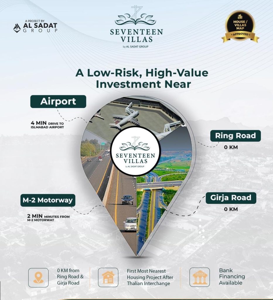 Seventeen Villas enjoys one of the most strategic locations in the Twin Cities. Situated right next to Thalian Interchange, the project offers 0 KM access from Ring Road and Girja Road, making it highly accessible from all major areas of Islamabad and Rawalpindi.