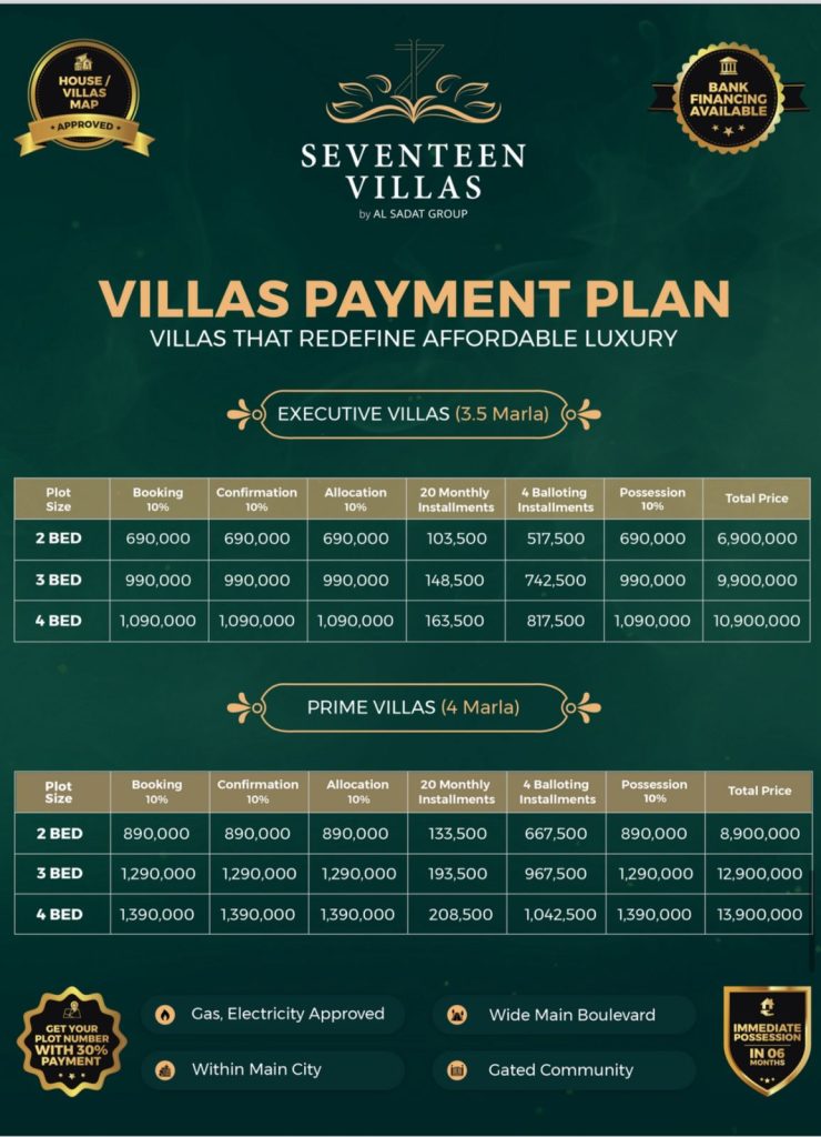Seventeen Villas by Al Sadat Group offers modern luxury living across a versatile range — spacious 3–5 bedroom luxury villas, plus Executive Villas (3.5 Marla) and Prime Villas (4 Marla) available in 2-, 3- and 4-bed layouts. Thoughtfully designed with contemporary architecture and premium finishes, each home enjoys landscaped green spaces, family-friendly amenities and smart living features. Set within a secure gated community with 24/7 surveillance and easy access to schools, hospitals and commercial hubs. Flexible payment plans and strong ROI potential make Seventeen Villas an ideal choice for both families and investors.